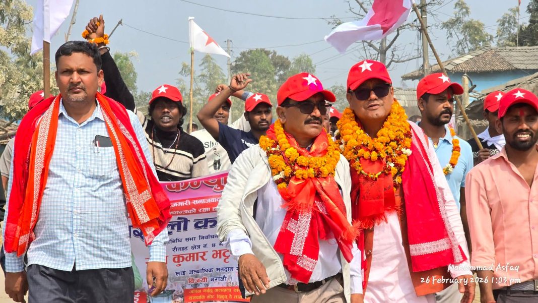 आगामी फाल्गुन २१ गते हुने प्रतिनिधिसभा निर्वाचनको मिति नजिकिँदै जाँदा रौतहट क्षेत्र नं. ४ मा चुनावी गतिविधि उल्लेखनीय रूपमा तीव्र बनेको छ। विशेषगरी वृन्दावन नगरपालिका क्षेत्रमा तारा छापका उम्मेदवारको घरदैलो अभियानले जनसागर उतारेको दृश्य देखिएको छ। टोल–टोलमा मतदाता भेटघाट, छलफल र अन्तरक्रियाले चुनावी माहोल झन् चहलपहलपूर्ण बनेको छ।