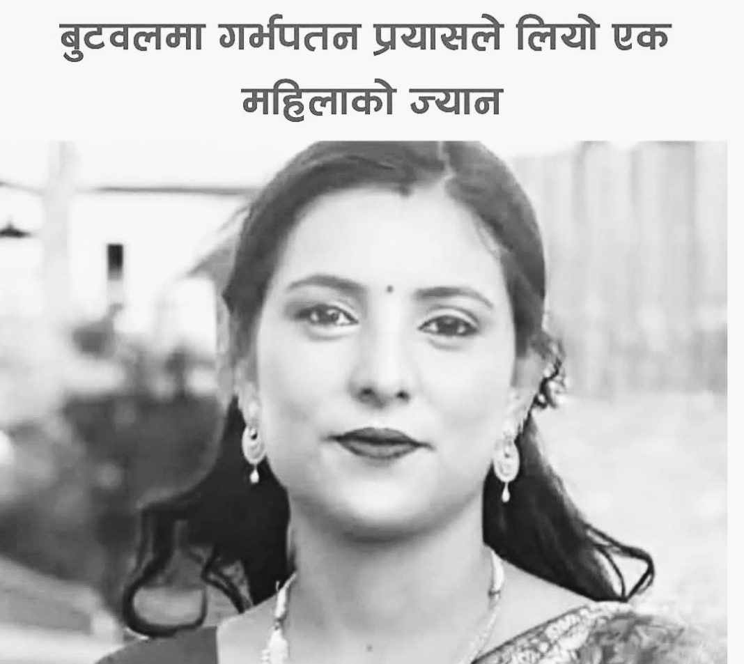 बुटवलमा विभिन्न क्लिनिक र अस्पतालमा उपचार गराउने क्रममा एक गर्भवती महिलाको मृत्यु भएको घटना सार्वजनिक भएको छ। पाल्पाको बगनासकाली गाउँपालिका–२ निवासी गीता पाण्डेको गर्भपतन प्रक्रियाका क्रममा ज्यान गएको प्रहरीले पुष्टि गरेको छ।